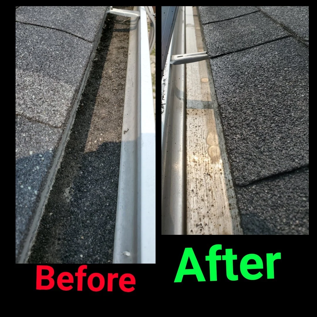 Before and after gutter cleaning photo; left side shows dirty gutter, right side shows clean gutter.
